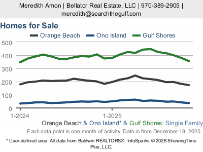 Meredith’s note: Inventory and supply tightened meaningfully year-over-year, but days on market rose. On Ono Island, that often points to a smaller pool of qualified buyers for higher price points, and the homes that win are the ones that feel truly turnkey or have a clear boating value story.