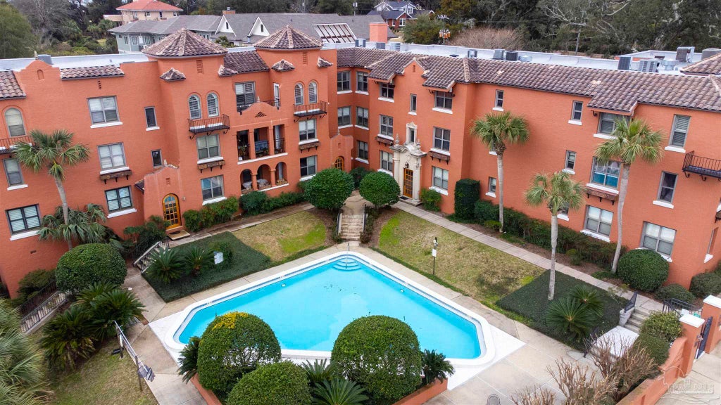 The Mirador offers a captivating blend of Mediterranean-style architecture and waterfront living, creating an enchanting retreat along the shores of Bayou Texar. This property is on the National Register of Historic Places and is nestled amidst meticulously landscaped grounds. These stunning condos boast timeless charm and modern amenities! As you step through the arched hallway door and enter your unit, you will be welcomed into the living room featuring a spiral staircase to the upstairs bedrooms and a view overlooking the pool. Off the living room is the updated eat-in-kitchen with quartz countertops, tiled backsplash and stainless steel appliances. A half bath and laundry are also located downstairs off the kitchen. Hardwood flooring runs throughout the home apart from the bathrooms which boast beautiful penny tile. There is a second exterior entrance which accesses the master bedroom, while the secondary upstairs bedroom overlooks the pool and has an attached full bath with mirrored vanity and a tub/shower combo. Across the landing, the spacious primary bedroom has private access from the buildings interior stairwell and features a large full bath attached. Unwind outside by the shimmering pool, surrounded by mature landscaping that enhances the tranquil ambiance. With water access to Bayou Texar just steps away, you can indulge in waterfront activities and savor the beauty of coastal living. Minutes away from downtown, Interstates, Mall, and Medical Facilities. Don't miss this rare opportunity to live in one of the most desirable areas of Pensacola!