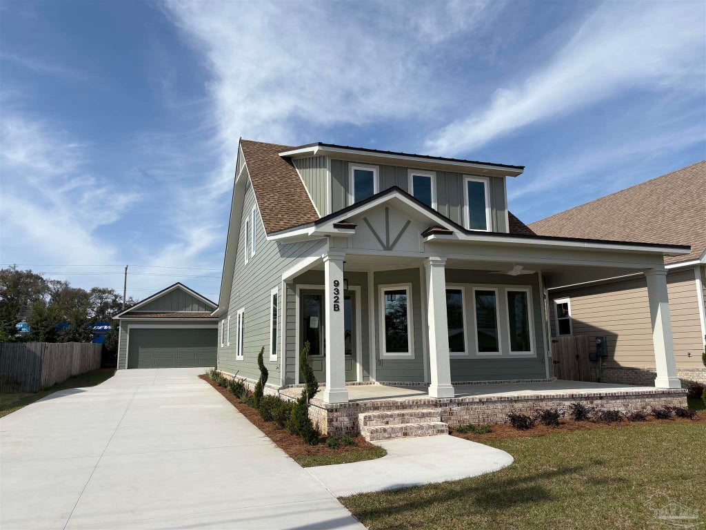This is a custom 4-bedroom 3 1/2 bath home with 10' ceilings on the main level, and 9' on second level. The primary bedroom/bath are on the ground level, as well as the powder bath and laundry. The home has 8' doors, cased openings, quartz counters, tile back splash in kitchen, recessed lighting, ceiling fans, spray foam in attic, crown molding, wood trimmed windows, impact glass windows, stainless steel appliances, gas stove top, double electric range/air fryer, custom hood, recessed lighting, ceiling fans, great storage with an abundance of cabinets in kitchen, tankless water heater, sprinkler system, barn doors, separate shower and tub in primary bathroom. There is a detached 2-car garage (21'x23'+-), covered front porch with views of a golf course which is across the street, and a covered porch to the rear that leads out to the detached garage and rear yard.