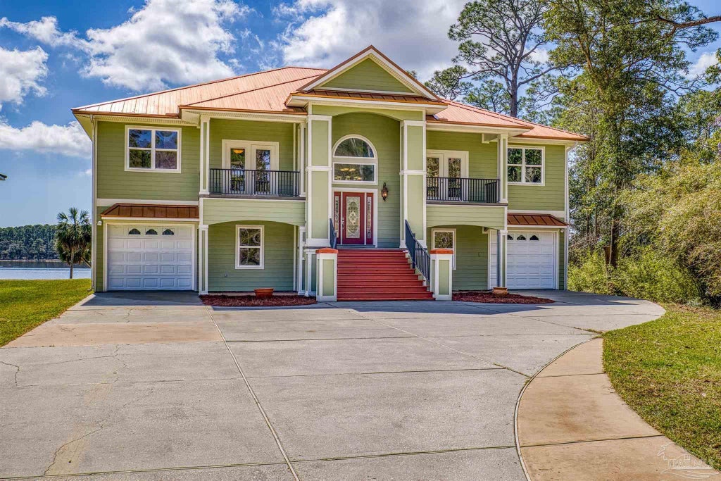 Searching for a Custom Waterfront Home Secluded by the Water in the Trees? Well, wait no more - you have found it here! This Beautiful Home sits on almost an acre of land and sits Majestically by the Waters Edge. The Grounds here are amazing and so many possibilities! Have a Garden, Bring your Boat, Water Toys, RV, whatever your heart desires! Plenty of Room Here. Step inside to an Elegant Foyer and then walk into the Open Concept Great Room with Fireplace, and Chef's Kitchen complete with Wall Oven, Warming Drawer, Prep Sink in the Island, Pro Cooktop w/Custom Hood and Professional Grade Appliances. The Water Views here are Amazing and the Sunsets are Breath Taking. There is a Large Formal Dining Room here also as well as a Breakfast Bar and Breakfast Nook looking out to the Water. Step outside on the covered deck and have your morning coffee. No one across the water from you but squirrels and deer. Privacy abounds! There is also an open deck on this level for entertaining or catching a few rays. Back inside step into the Large Primary Suite complete w/custom soaking tub, separate shower and water views! Down the hall, you will find 3 additional large bedrooms and two more baths on this level - one is a shared bath for the two guest bedrooms. Head downstairs for another full bedroom & Bath and a Very Large GameRoom and two separate large Garages. There is a covered patio on this level & an outdoor shower. There is a Metal Roof here (recently inspected) as well and low maintenance on this home. Another awesome feature is there IS an ELEVATOR SHAFT. All you would need to install is the actual elevator as the shaft is ready. This home would be great as a primary residence, AirBNB, or multigenerational home. This property is close to NAS Pensacola, Beaches, Shopping and Entertainment and is ready for a new owner. SELLER SAYS MAKE OFFER!!
