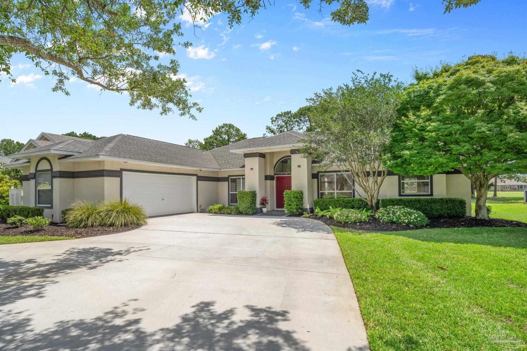 This is your opportunity to own a beautifully maintained home in the highly sought-after Tiger Point Golf Club community! Perfectly positioned on the golf course, this single-story, 4-bedroom, 3-bath residence offers stunning views and peaceful afternoons right from your backyard. With a spacious 2-car garage, this home also has room for a future pool—imagine the ultimate outdoor retreat! Step inside to discover an open, light-filled floor plan highlighted by soaring 12-foot ceilings and expansive windows. The heart of the home features a welcoming living room with a built-in electric fireplace, seamlessly flowing into the kitchen with a large breakfast bar and eat-in dining area. Need flexibility? Use the formal dining room as a casual living space or create the dining room of your dreams! One of the standout features is the climate-controlled Florida room—ideal for relaxing with golf course views or entertaining guests. Step outside to a newly landscaped backyard with a freshly painted interior, 2021 appliances, and a new circular driveway. The seller is even including a recent survey and preliminary pool plan for your convenience. This home offers a true in-law suite with its own private entrance and en suite bath, perfect for guests or multi-generational living. The primary suite is a luxurious retreat with dual vanities, dual walk-in closets, a soaking tub, and a tiled shower. Located in a golf cart-friendly neighborhood just minutes from shopping, dining, and the sugar-white sands of the Gulf Coast, this home delivers the best of Gulf Breeze living. A brand-new local market, The Local, has just opened nearby—perfect for creating lifestyle content to promote the area and your new home. Don’t miss your chance to live in one of Gulf Breeze’s most desirable golf course communities!