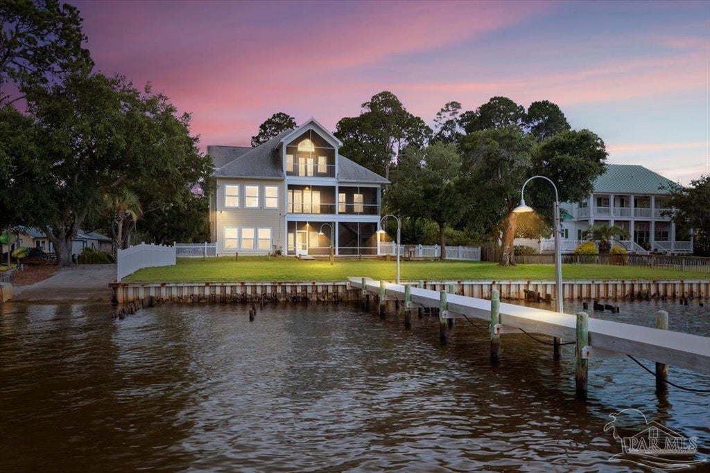 Private Boat Ramp, 1.3 acres, Elevator, Dock, Lift, No HOA, 120 feet or shoreline- This 4,080 sq ft waterfront home has it all. 5 bedrooms, 3 full bathrooms, and versatility for multi-generational living or income potential. A rare private on-site boat launch and flow-through dock with boat lift make jet skiing, boating, and waterfront fun effortless. The dock also features a covered entertainment space with electricity, water-misting, plumbing, and security cameras—perfect for cleaning fish or sunset gatherings. Designed for comfort and accessibility, the home includes an elevator servicing all three levels. The lower level functions as its own living quarters with 2 bedrooms, a full bath, a kitchen, and living area, making it ideal for guests, rental income or in-laws. The middle level encompasses 2 more bedrooms, a full bath and a versatile entertaining space with an open concept design. The bright kitchen boasts gourmet appliances and spacious granite counter tops. A generous island with seating for six ensures the chef stays at the heart of every gathering. A modern, elegant fireplace anchors the living room, creating a warm and inviting space—yet the expansive views of East Bay, visible across the entire back of the home, remain the true focal point. The top-floor Owners suite is a true sanctuary, offering views of both the private estate and the bay. Enjoy three stories of screened porches that stretch across the rear of the home—ideal for dining al fresco, morning coffee, or simply watching dolphins at play. Outdoors, you’ll find the beautifully maintained grounds with plenty of space for a pool. The home sits directly on the paved multi-use path that connects Gulf Breeze and Navarre—perfect for stroller walks, jogging, biking, and golf cart rides. This property in the well maintained community of Lagniappe Beach has no HOA. Whether you're enjoying nature, or launching onto the water, this rare gem delivers the ultimate in waterfront living.