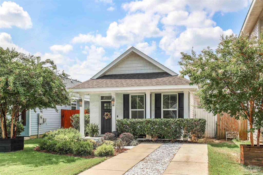 Welcome to your own slice of paradise in vibrant downtown Pensacola! This meticulously maintained 2-bedroom, 2-bath cottage-style home seamlessly blends modern upgrades with classic curb appeal. From the moment you arrive, the inviting front porch, manicured landscaping, and cheerful façade set the tone for this lovingly cared-for residence. Step inside to a bright and airy open-concept living space featuring soaring vaulted ceilings, recessed lighting, and luxury vinyl plank flooring throughout. The stylish kitchen boasts crisp white cabinetry, stainless steel appliances, gas range, quartz countertops, subway tile backsplash, and a spacious island with bar seating—perfect for entertaining. The owner’s suite features a tray ceiling, large walk-in closet with custom built-ins, and an en-suite bath complete with a sleek, modern shower and dual vanities. A thoughtfully designed layout provides privacy between bedrooms, ideal for guests or a home office setup. Step outside to discover your backyard retreat—complete with a covered deck, built-in seating, and a raised pool ideal for cooling off on warm Florida days. Whether you're hosting a barbecue, relaxing under the shade, or gathered around the fire pit, this fully fenced yard offers the perfect space for both play and relaxation. Additional highlights include an indoor laundry area, upgraded lighting fixtures, and off-street parking. Located just minutes from downtown restaurants, shops, Blue Wahoos Stadium, and Pensacola Bay, this home delivers the perfect combination of comfort, character, and convenience. Don't miss the chance to own this downtown Pensacola gem!