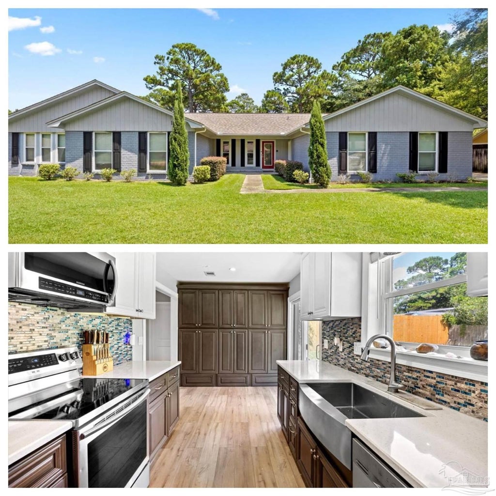 Updated, Upgraded & Move-In Ready! This beautifully updated 4-bedroom, 2-bath brick home is ready for its new owners. Step inside to soaring cathedral ceilings in the living room, complete with a modernized fireplace and easy access to the fenced backyard. Just off the living area, a stylish wet bar with a wine/beverage refrigerator makes entertaining a breeze. The kitchen will delight any chef, featuring quartz countertops, stainless steel appliances, a farmhouse sink, and abundant cabinetry—including a full pantry wall. Retreat to the spacious primary suite with two walk-in closets and a spa-like bathroom offering a custom tiled shower, double vanity, freestanding tub, and private water closet. Throughout the home, you’ll find no carpet—only new luxury vinyl plank flooring (2025) and tile for a fresh, modern look. Enjoy easy Florida living in your private backyard, complete with room for a pool and no HOA restrictions. This property would make a fantastic investment property or a wonderful place to call home. Major updates bring peace of mind: new roof (2021), HVAC (2018), water heater (2018), and newer doors and windows (2021). All of this in a prime location—just 7 miles from the sugar-white sands of Pensacola Beach, close to shopping, dining, and top medical facilities. Zoned for top-rated schools: Oriole Beach Elementary, Gulf Breeze Middle, and Gulf Breeze High.