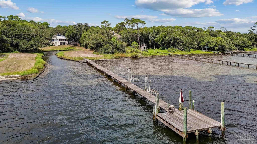 Waterfront retreat on the Santa Rosa Sound! Enjoy privacy, peace, and panoramic water views from this high-and-dry 1.5+ acre property with over 600 feet of waterfront and a private dock. This spacious custom home offers up to 6 bedrooms, including two primary suites and a private guest/in-law suite with its own entrance. Built to last with concrete and steel construction, it features soaring ceilings, custom woodwork, a stone fireplace, and a geothermal system for energy efficiency. Nearly every bedroom has its own tiled bath, and the huge laundry room and walk-in pantry add convenience. The refinished, climate-controlled basement (approx. 1,200 sq. ft.) provides endless options—gym, studio, or storage. Relax on the deck or in the Florida Room overlooking the Sound. Car enthusiasts will love the 12-car detached garage/workshop with a new metal roof. No HOA, A-rated schools nearby, and an ideal location between Pensacola Beach and Navarre Beach. Roof 2021.