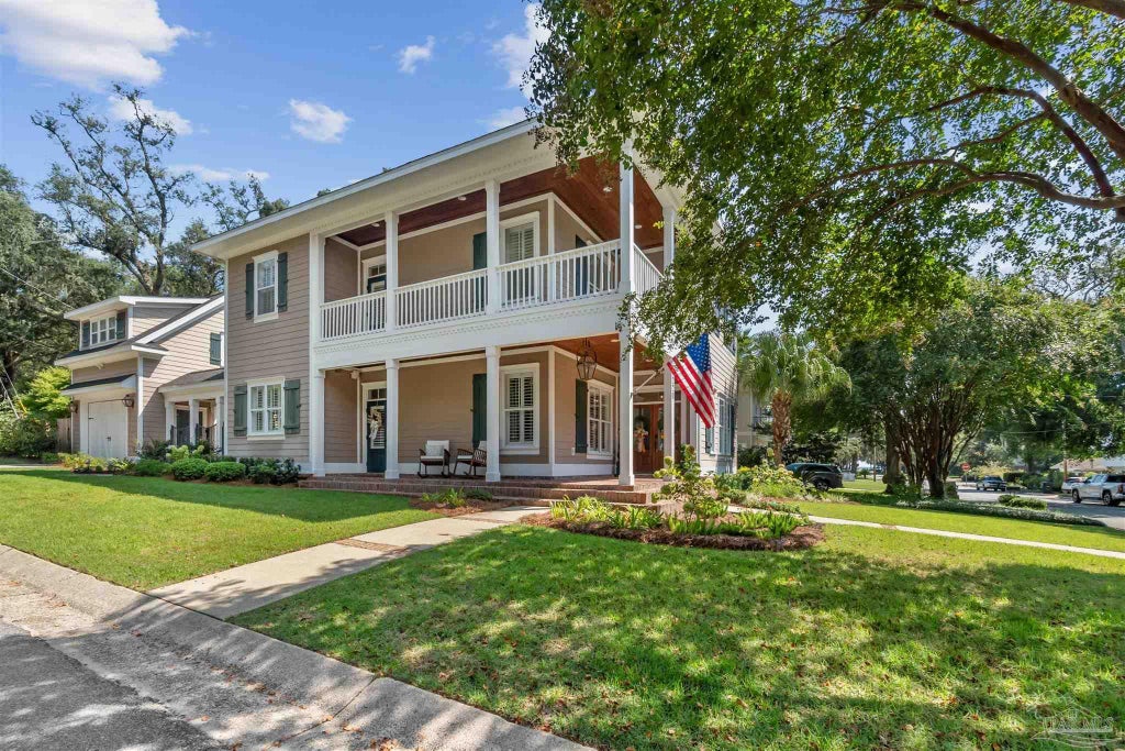 Enjoy the elegance, and convenience of East Pensacola Heights living in this exceptionally appointed 4-bedroom, 3-bathroom home with a detached 1-bedroom, 1-bathroom apartment. From the moment you arrive, the two-story façade framed by lush landscaping and gas lanterns sets the stage for the sophistication inside. The main home offers soaring ceilings with crown molding and recessed lighting, engineered hardwood floors, LVP and plantation shutters throughout. The gourmet kitchen features honed black granite countertops, a 36” professional gas stove with cast iron griddle, custom hood, and brand-new LG Smart refrigerator and dishwasher (2024). A walk-in pantry with wood shelving, wet bar with wine refrigerator, and custom cabinetry provide exceptional storage and functionality. The open living area is ideal for entertaining, with a full guest suite and bath on the main level, along with a mudroom, custom desk/office space, and built-in lockers. Upstairs, the spacious master suite offers a spa-like bathroom with an oversized cast iron soaking tub, tiled walk-in shower, and a custom-built closet. Two additional bedrooms, a full bathroom, an upstairs laundry room and multiple linen closets complete the second floor. Outdoor living includes expansive wraparound porches upstairs and down with beautiful tongue and groove ceilings—plus a brick-paver courtyard, irrigation system on a separate meter, outdoor hot water shower, and private entertaining spaces. The detached apartment above the garage has been fully updated with a new deck, exterior elevator, plantation shutters, on-demand water heater, and lighting, making it perfect for guests or as a short-/long-term rental. Additional upgrades include a new roof (2020), tankless Rinnai hot water heater (2024), Cat 5 wiring, hurricane fabric/vinyl shields for all windows and doors. Buyer to verify all measurements and information.