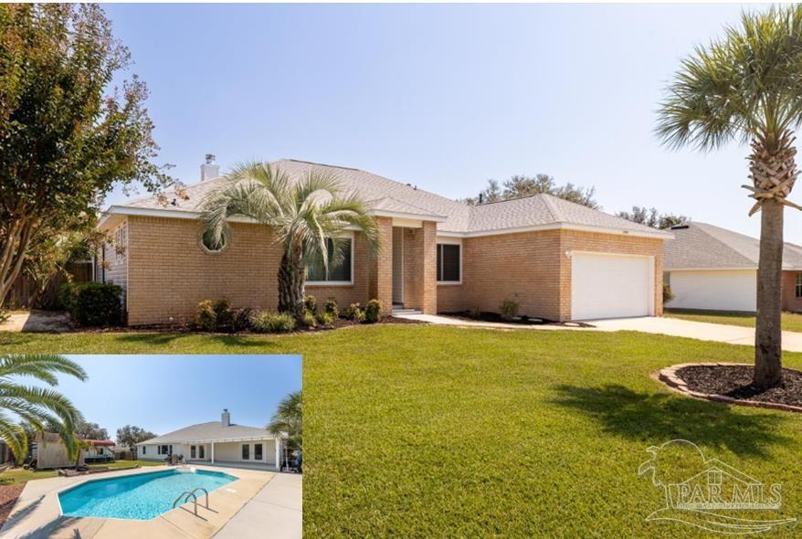 Waterfront neighborhood Pool Home! New Roof! 2024 Impact Windows! Impact Doors! Carport for Boat or RV! 4 Bedroom home in Lighthouse Pointe, a waterfront community in Gulf Breeze that features a waterfront recreation area, Tot Park, fishing pier, underground utilities and sidewalks. Enjoy the privacy fenced outdoor living space, spacious Lanai and open patio with seating area. This home features luxury wood designed vinyl plank flooring, cathedral ceiling, fireplace with mantle, French Impact glass doors to the Lanai and wall of windows in great room overlooking the pool. The Kitchen and breakfast bar open to the dining room and living areas adding an easy flow for comfortable living. Kitchen includes granite counter tops, stainless appliances including refrigerator, gas cooktop range, 2021 microwave, dishwasher, disposal and pantry. The Master Suite boasts French doors to Pool Lanai, two closets, newly renovated bath with granite top split vanities and tiled shower. Other features include Saltwater Pool with 2022 liner, 10x14 storage building, 2024 lawn pump, 2022 pool pump and heater, 2017 HVAC, 2012 gas water heater. Enjoy walking, biking, fishing or just relaxing by the water. Only minutes to the white sugar sand beaches and emerald waters of the Gulf of America, shopping, schools, Pensacola State College's Gulf Breeze campus, and the Gulf Breeze Zoo.