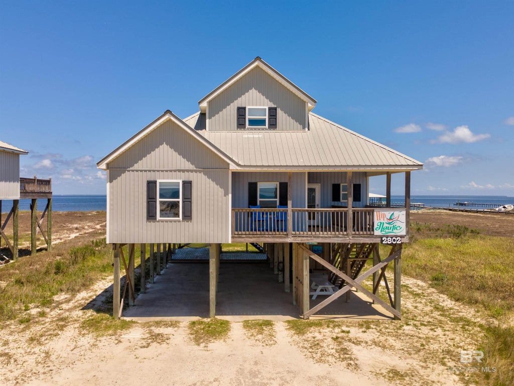You'll love the fabulous waterfront views from this beautiful 5 bedroom 3 bath home located on the Mississippi Sound on Dauphin Island! Porches galore afford your family a spectacular view and outdoor spaces to enjoy Island life at its finest. Inside this large home, you'll find 3 bedrooms, 2 baths, a laundry room, living, dining and kitchen on the main level. Upstairs are two more bedrooms, one with a private porch overlooking the water and the other outfitted with built in bunk beds, and a full bath. From the moment you walk up the stairs to the covered street side porch and into the foyer, you'll know you've found something special. This is not your ordinary beach house! The layout is perfect with the large great room and kitchen extending along the waterfront side of the house. Everyone will want to be in the kitchen. It has granite countertops, built in stainless steel appliances, an electric cooktop in the island and tons of cabinets. The open concept incorporates the kitchen, dining area and great room, with seating at the bar and a large dining table and chairs. The great room has a two full sized reclining sofas positioned to enjoy both the incredible view and TV. There is a covered deck and open decking too just off the great room where you'll enjoy the wonderful sea breeze. Underneath the house is an outdoor shower, a storage room for beach toys, boat supplies and bikes and covered parking. Sold beautifully furnished with new living room and master bedroom furniture, you won't have to do a thing but relax and enjoy all that Island life has to offer - Boating, great fishing and crabbing, paddle boarding and gorgeous sunsets which gave Dauphin Island its official designation of Sunset Capital of Alabama. All information provided about the property, including but not limited to square footage, is deemed reliable but is not guaranteed and should be independently verified. Buyer to verify all information during due diligence.