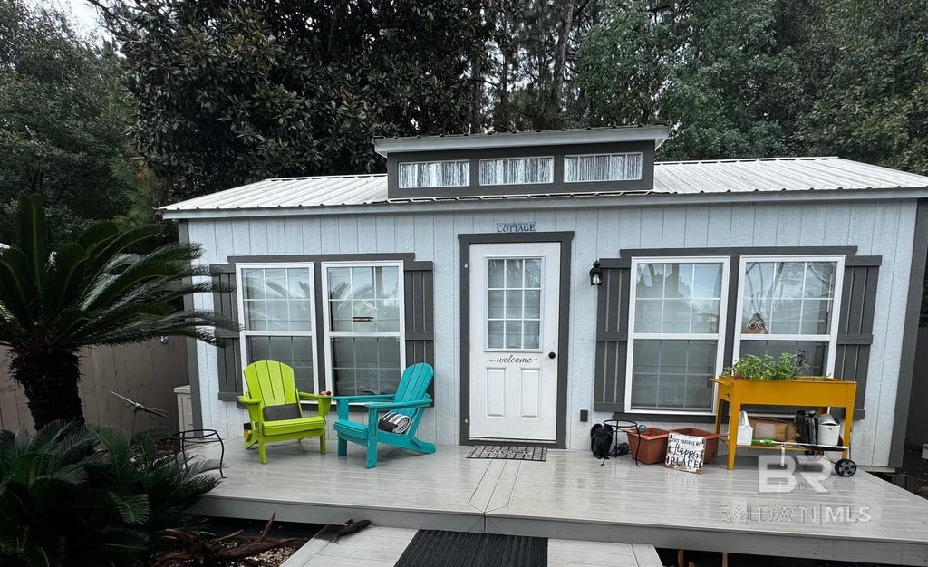 Coastal tiny home tucked in the charming beach town of Lillian, Alabama. Thoughtfully designed with beachy flair and modern touches, this custom-built 2023 home makes the most of its tiny footprint with a smart, stylish layout that includes sleeping area, full bath, kitchen, and cozy living area. Inside, you’ll find shiplap accents, butcher block countertops, a farmhouse sink, and durable vinyl plank flooring that adds warmth and character throughout. The kitchen is both functional and inviting, and the bathroom features a walk-in shower with a built-in shower seat. Comfort comes easy with continuous hot water, heating and air conditioning, and all-new electric and plumbing systems. Built beyond code and rated to withstand winds up to 165 mph, this home offers long-term peace of mind without sacrificing style. Situated on a fully fenced 40x86 lot, the property has tropical landscape with usable front and backyard space and backs up to 100 acres of for added privacy. A brand-new 17x16x35 RV cover (installed in 2025) offers generous space for RV parking (RV hookups), and there’s plenty of room for boat parking and your other aquatic toys. This beachside retreat is move-in ready and made for coastal living. Located in the beachside, pet-friendly community of Spanish Cove on the AL/FL line, this home is just 5 minutes from the Lillian boat launch and 15 minutes from Gulf beaches. Enjoy amenities like a private beach, 500-ft pier, two clubhouses, year-round pool, sports courts, fitness center, playground, trails, and golf cart access. The community offers social events, games, classes, clubs, and group travel. Whether you're looking for a full-time residence or a peaceful coastal getaway, this is a great place to call home—schedule your showing today. Buyer to verify all information during due diligence.